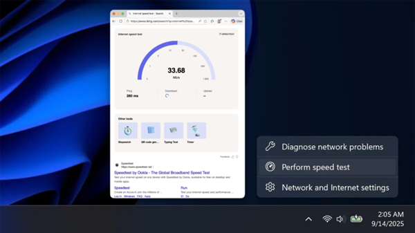 用户未来只需右键点击系统托盘网络图标,或在Wi-Fi与蜂窝网络的快速设置中即可直接启动网速诊断,无需再手动打开浏览器或运行第三方测速工具。