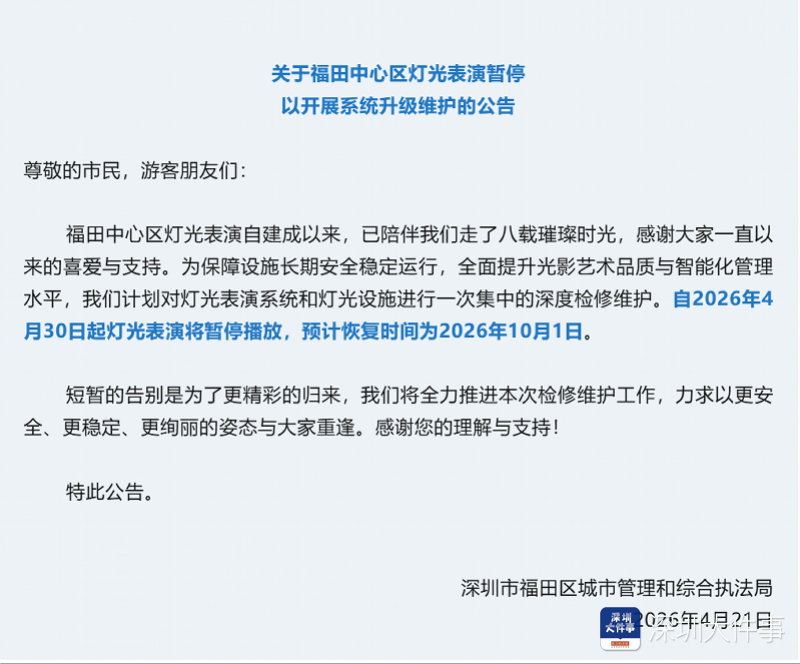 java资源网站 深圳福田灯光秀将暂停5个月,预计国庆回归